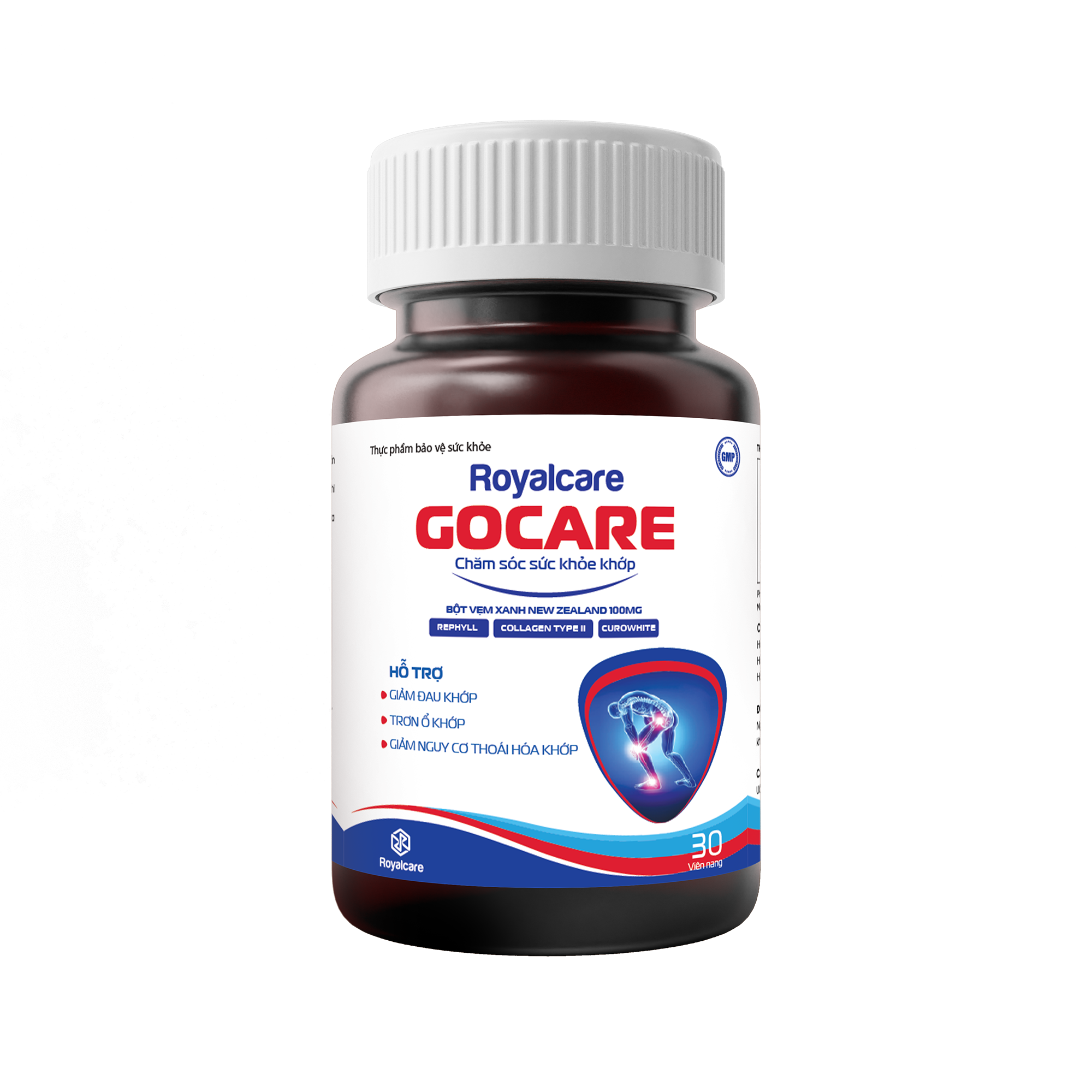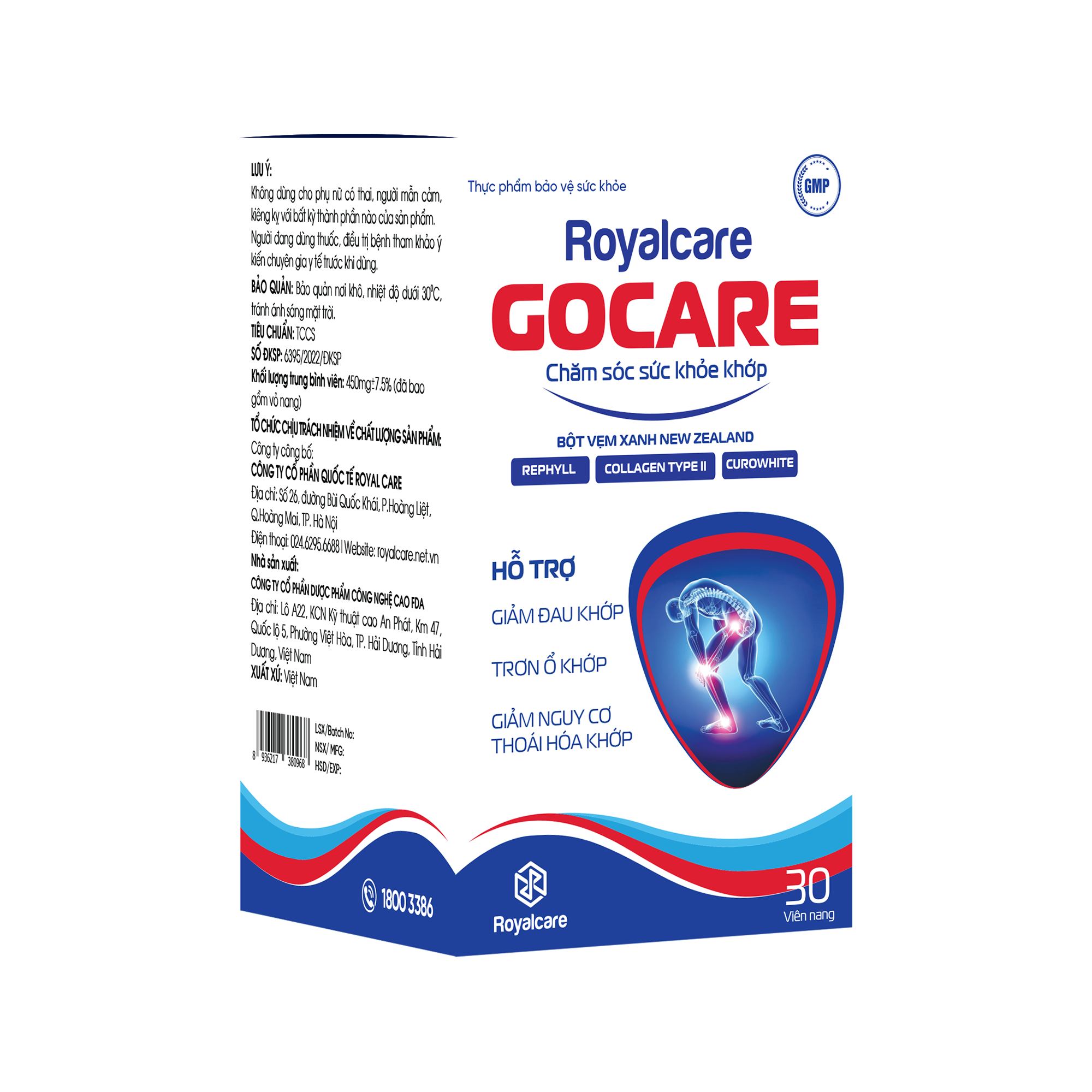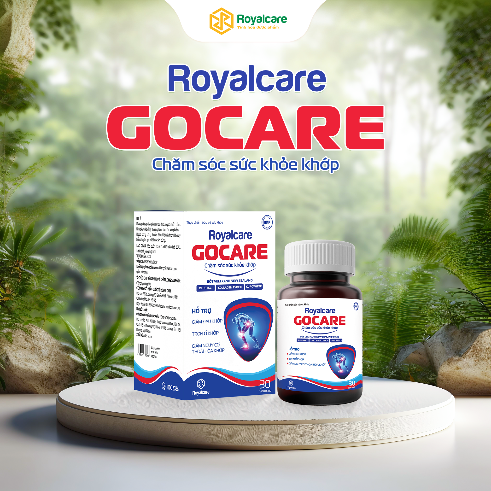 Thực phẩm bảo vệ sức khỏe ROYALCARE GOCARE là sản phẩm hỗ trợ cho người lớn có các triệu chứng đau khớp, khô khớp do viêm khớp, thoái hóa khớp. Với các thành phần thảo dược tự nhiên như chiết xuất hạt tiêu đen, bột vẹm xanh New Zealand, nghệ trắng Curowhite… được nhập khẩu, Gocare giúp hỗ trợ giảm nguy cơ thoái hóa khớp, tăng tiết dịch khớp, làm trơn ổ khớp.